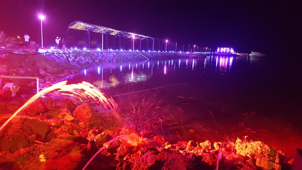 Great for outings with friends and family. You can opt to sit inside in an aircondtioned environment or outside with a beachfront view. The traditional Arab seating arrangement, the smell of bakhour (incense) in the air and sheesha served along with your favorite beverage makes it a fantastic experience. Also, there is a ticket counter for motorboat rides and they are absolute fun. There is a mosque here and also rooms if you want more privacy. The place looks beautiful at night because of the lighting of different colors. Must visit if you come to Jazan.